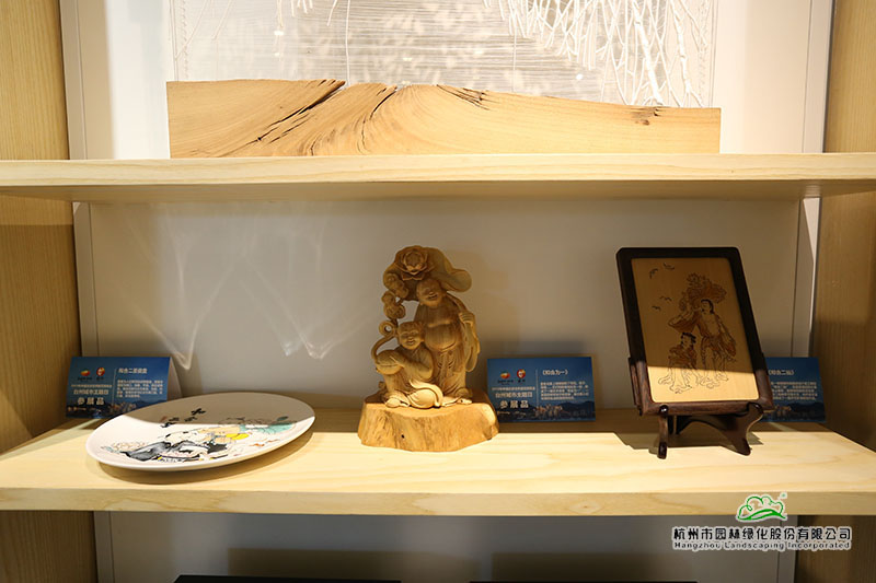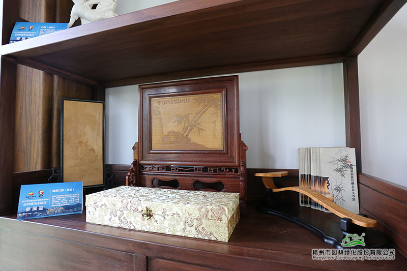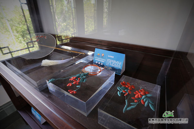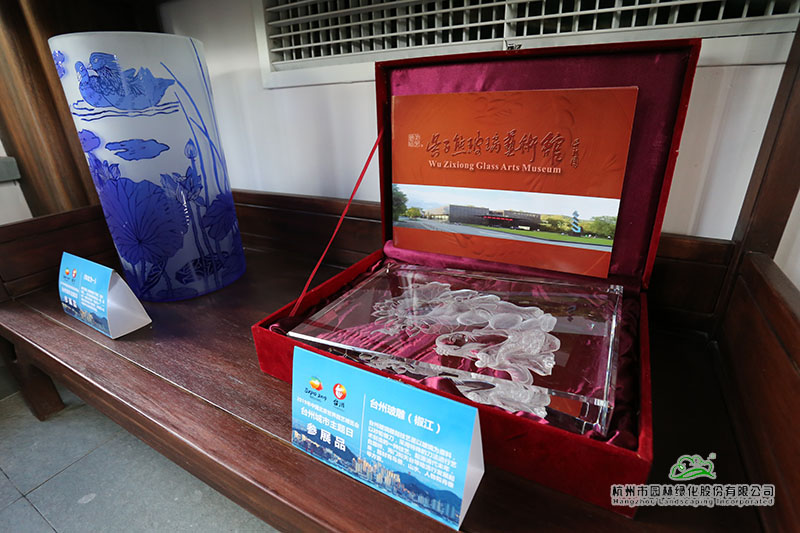 在以浙派民居为风格的主题建筑“富春山居”内,展示着来自仙居的无骨花灯、温岭的石雕、黄岩的翻簧竹雕、椒江的台州玻雕、台州刺绣等精美的展品。